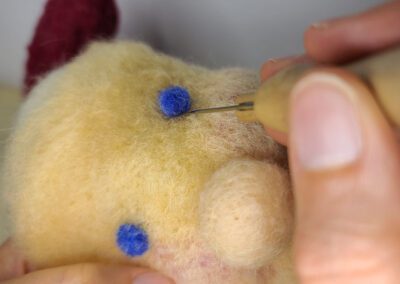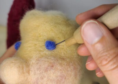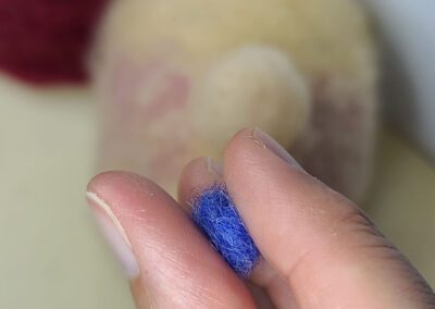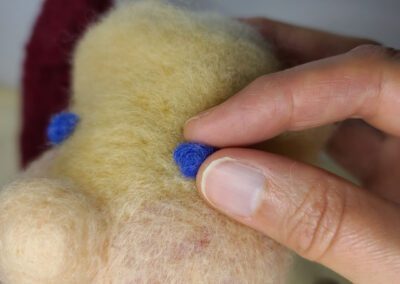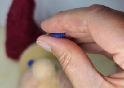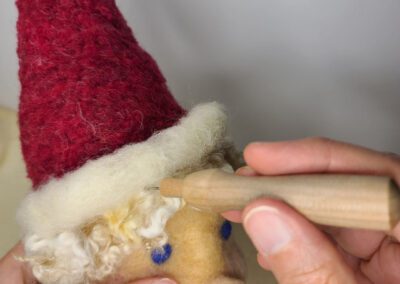 Like the button nose, Santa’s eyes are simplified in this design. All you’ll need to do is roll a small amount of blue (or black or brown) wool in your fingers to create a small ball. The key to adding your eyes to the face is to slowly felt around the outside edges of the small ball, just like the nose. If you do felt the eyes from the center you’ll push the wool into the face and the eyes will flatten out and get much smaller.