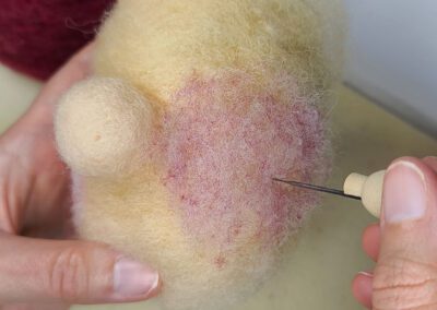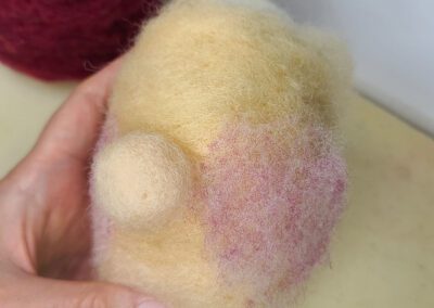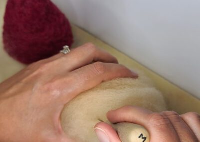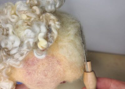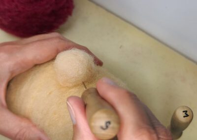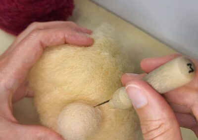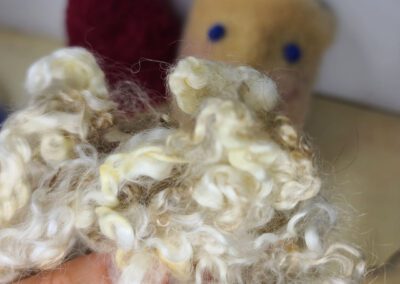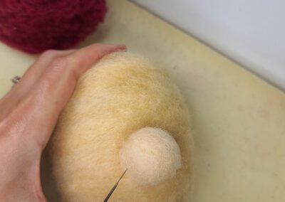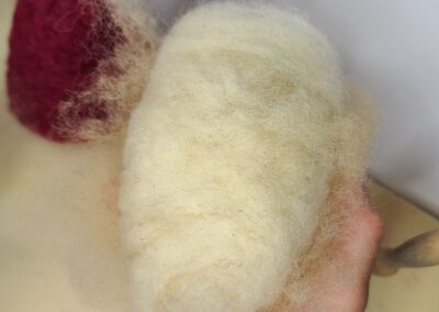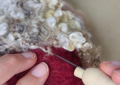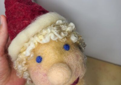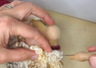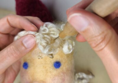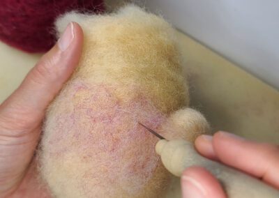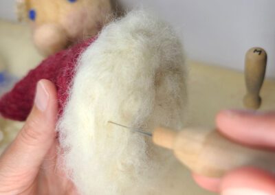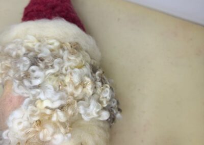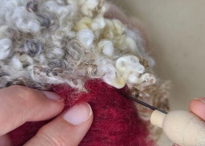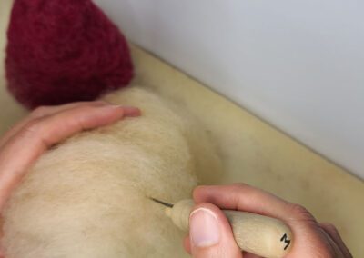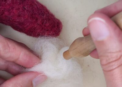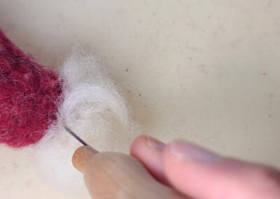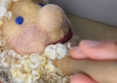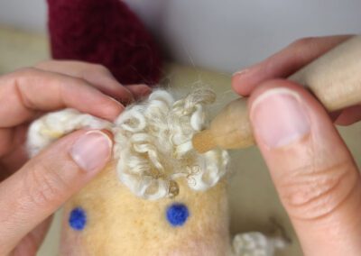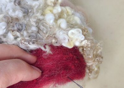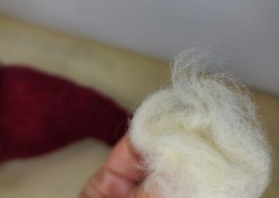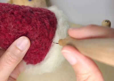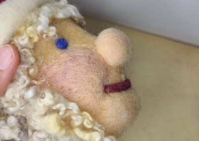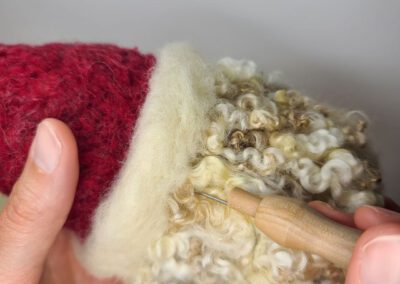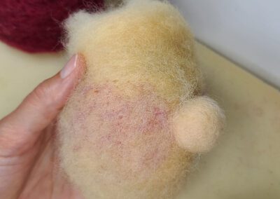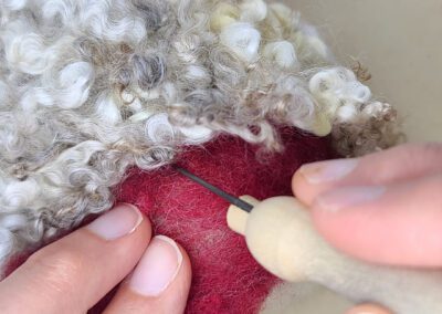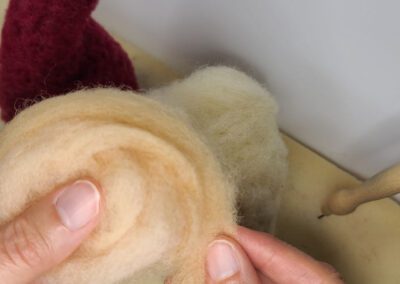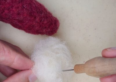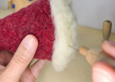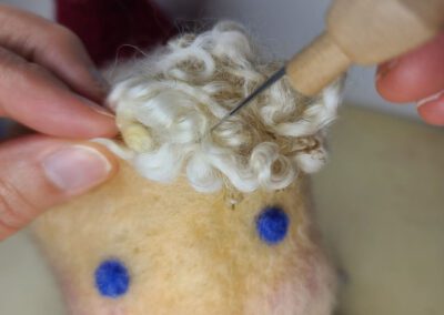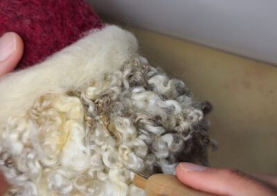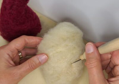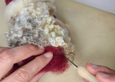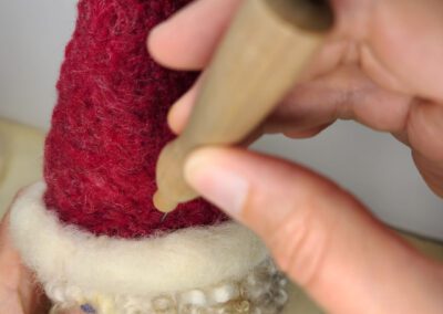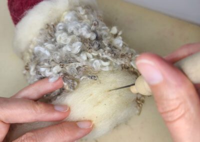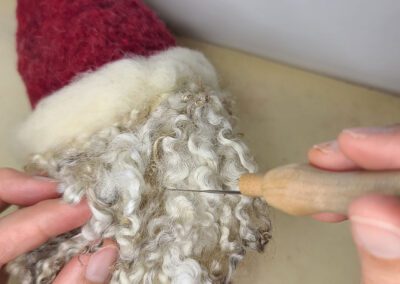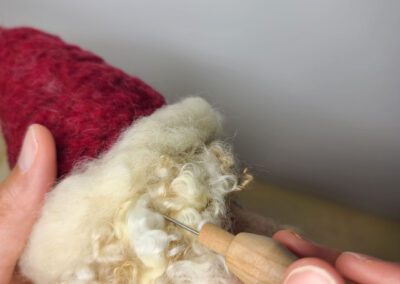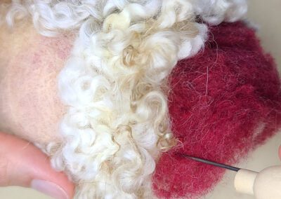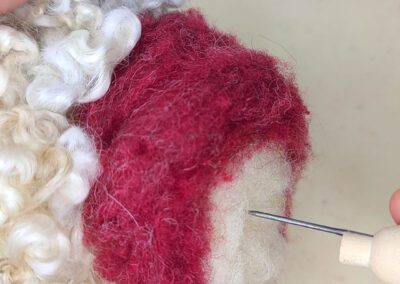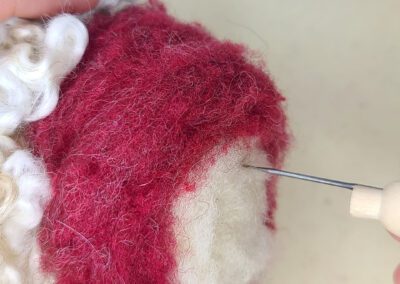 To ensure Santa will sit balanced on a flat surface we need to make sure the bottom is flat, dense, and level. Working back and forth between placing Santa on the table and adding small pinches of core wool you will felt the base into a flat surface that is dense enough to act as a pedestal. The front of the base will be covered by curly locks of the beard and we’ll cover the back with red wool of Santa’s coat that will peek out under the curly locks of this hair.