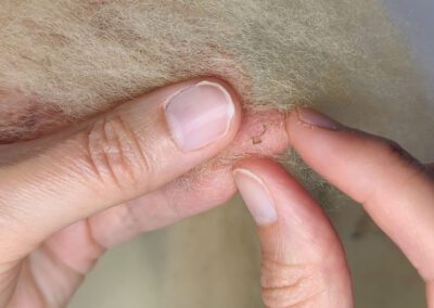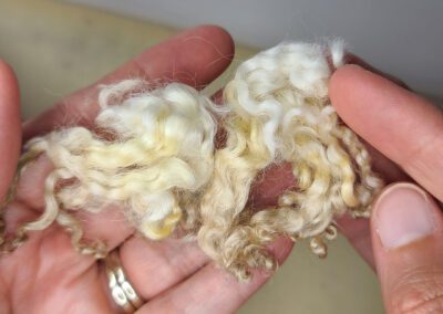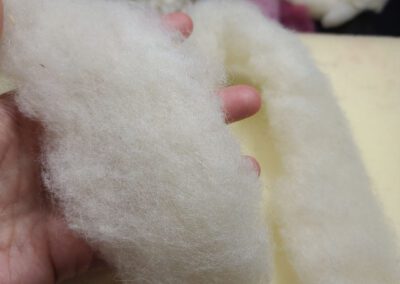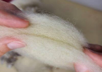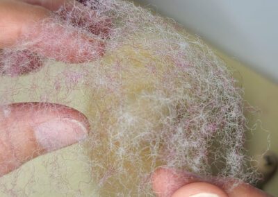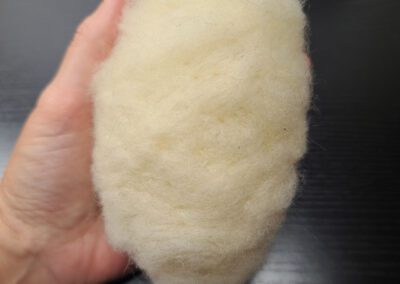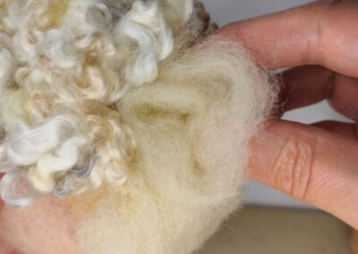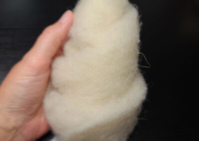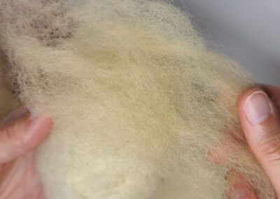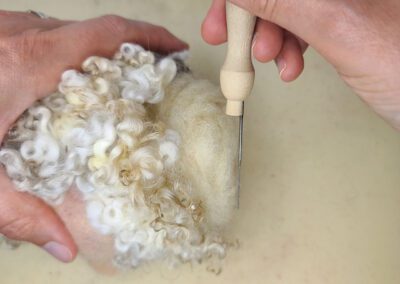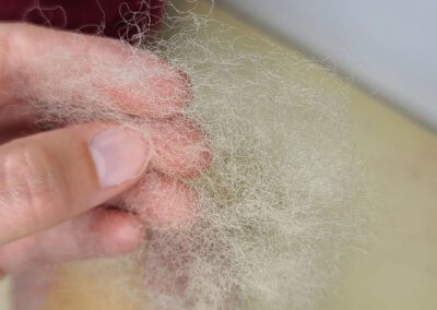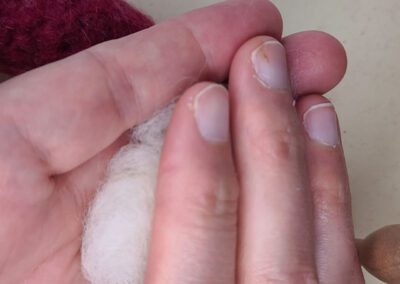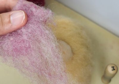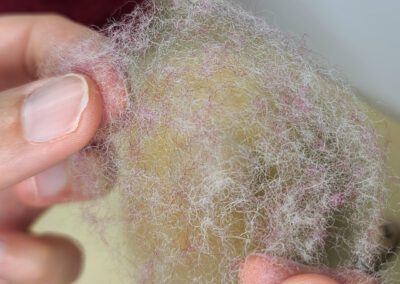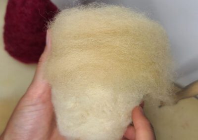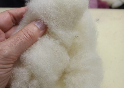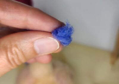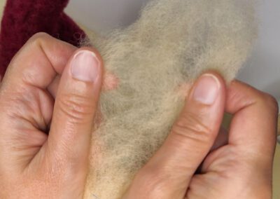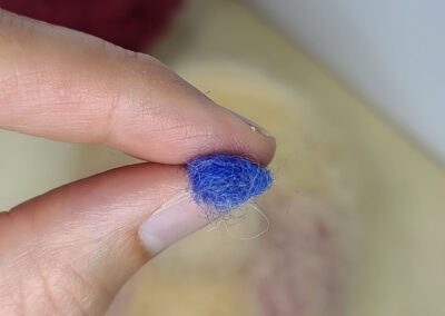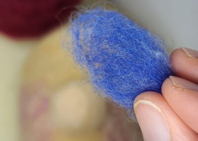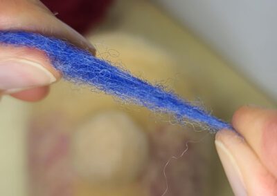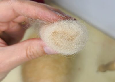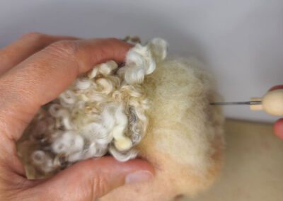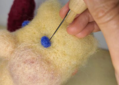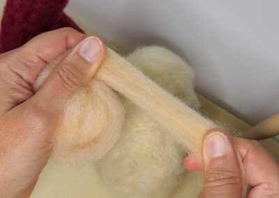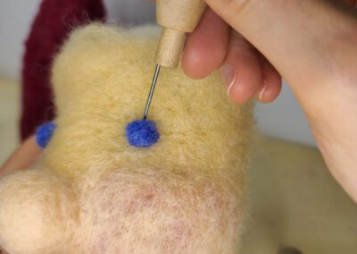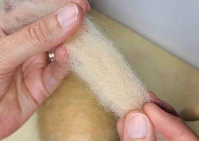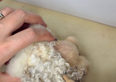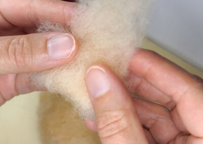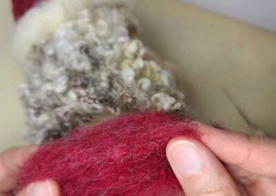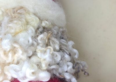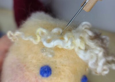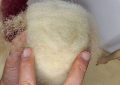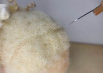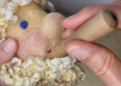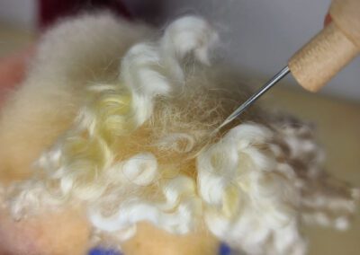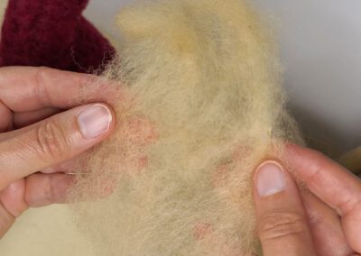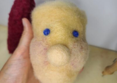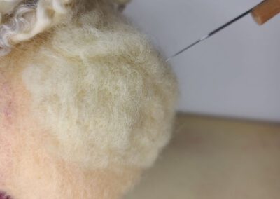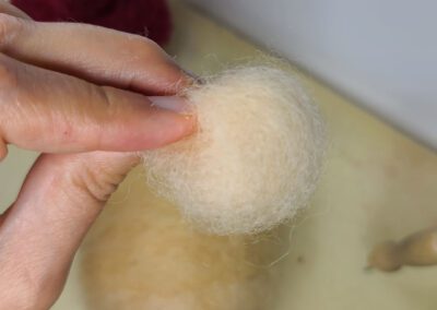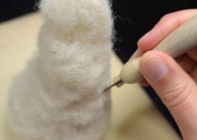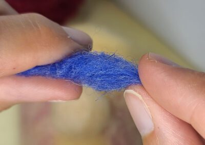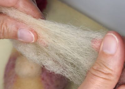 To ensure Santa will sit balanced on a flat surface we need to make sure the bottom is flat, dense, and level. Working back and forth between placing Santa on the table and adding small pinches of core wool you will felt the base into a flat surface that is dense enough to act as a pedestal. The front of the base will be covered by curly locks of the beard and we’ll cover the back with red wool of Santa’s coat that will peek out under the curly locks of this hair.