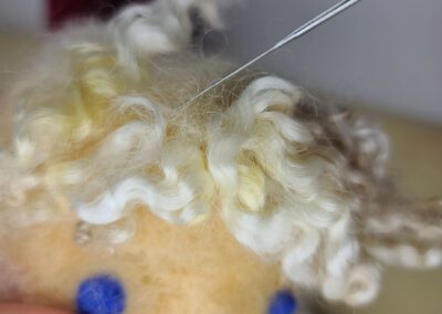 In the 3D Santa design, I don’t worry about adding ears since his head and cheeks are covered with curly locks. Adding the beard and mustache is best done slowly to keep the locks very curly and the lips visible. When a pinch of curly locks has a bulkier, fluffier section of wool I attach that portion to the shape first and then gently pin the delicate curly locks in place over the fluffier wool fibers.