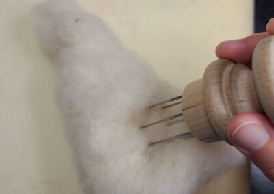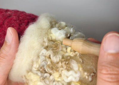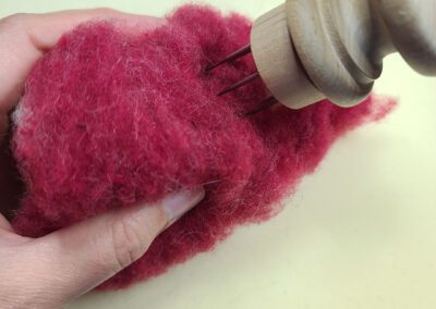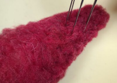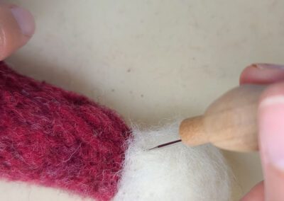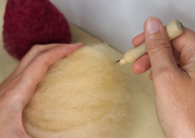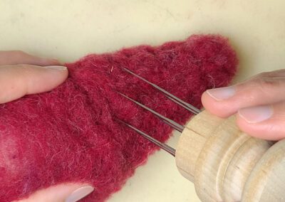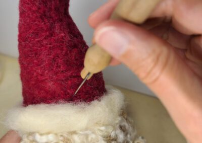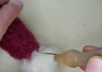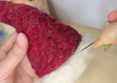 As you form the shape of the hat and then cover it with red wool be sure to swap out your needles for efficiency. If you only have single needles that is perfectly fine. If you do have multi-needle tools it is helpful to use both style tools during the steps of forming basic shapes and then covering the shape with colored wool. The more you felt, and the more frequently you felt, the more important tools become. The motion of needle felting and continuous grasping with your thumb and forefingers is made easier with proper felting needle tools.
