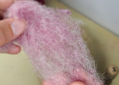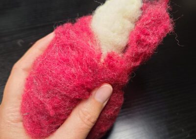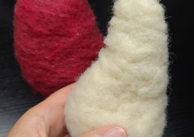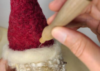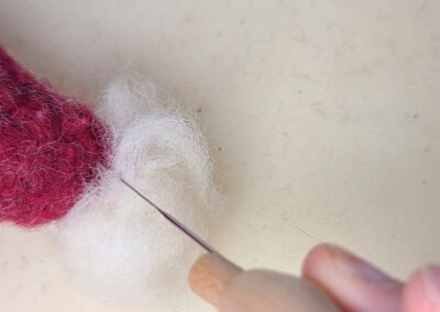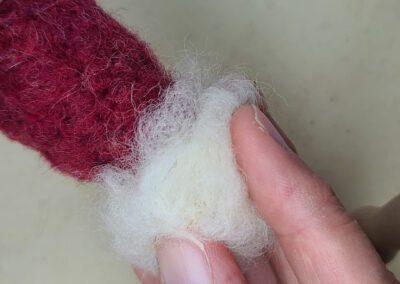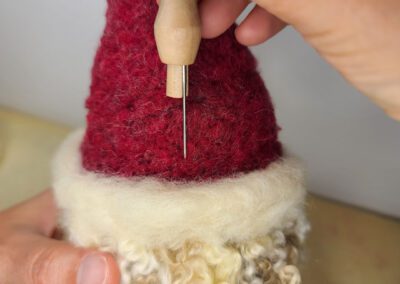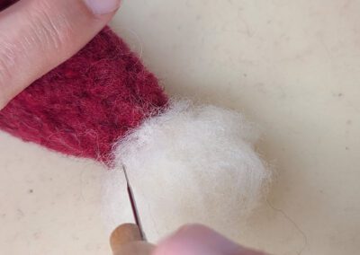 Using core wool we form the shape of Santa’s hat and then cover it with red wool. This approach preserves your colored wool and will save money!