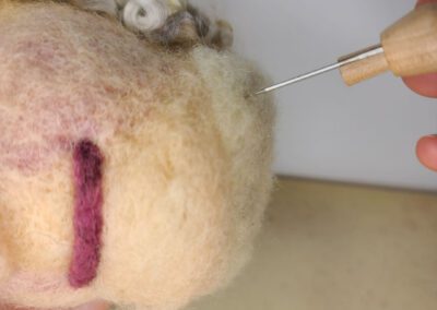 In my portrait lesson, I go over forming a nose with nostrils, but to simplify this design we’re going to give Santa a basic round nose. Be sure to do the bulk of your felting around the edges of the nose to attach it to the face. If you felt too much across the top it will flatten out the nose.
