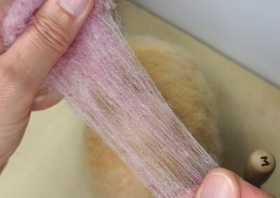 With the core shape of your face complete the next step is to cover the face with your chosen flesh tone. If you are using roving, pull the fibers apart to flatten out the wool and wrap it around the front of the face. You do not need to cover the back of the head with the flesh tone wool since that will all be covered with curly locks.