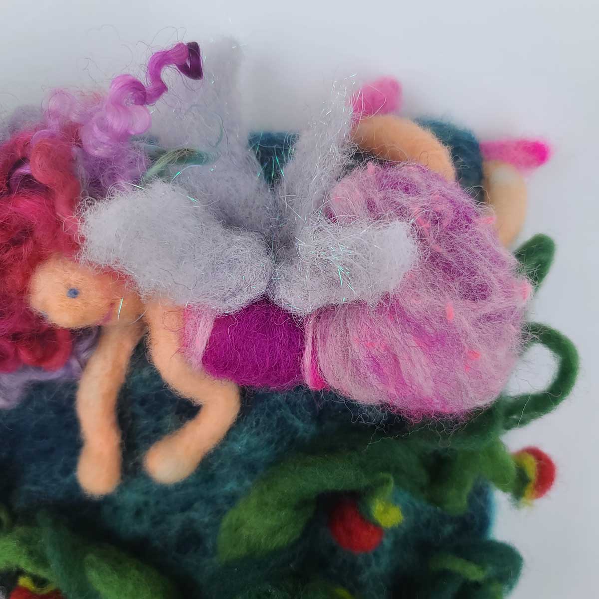 This 10″ x 10″ felted illustration features Viève’s mermaid tail popping out of the magical shell portal to Lichendia.