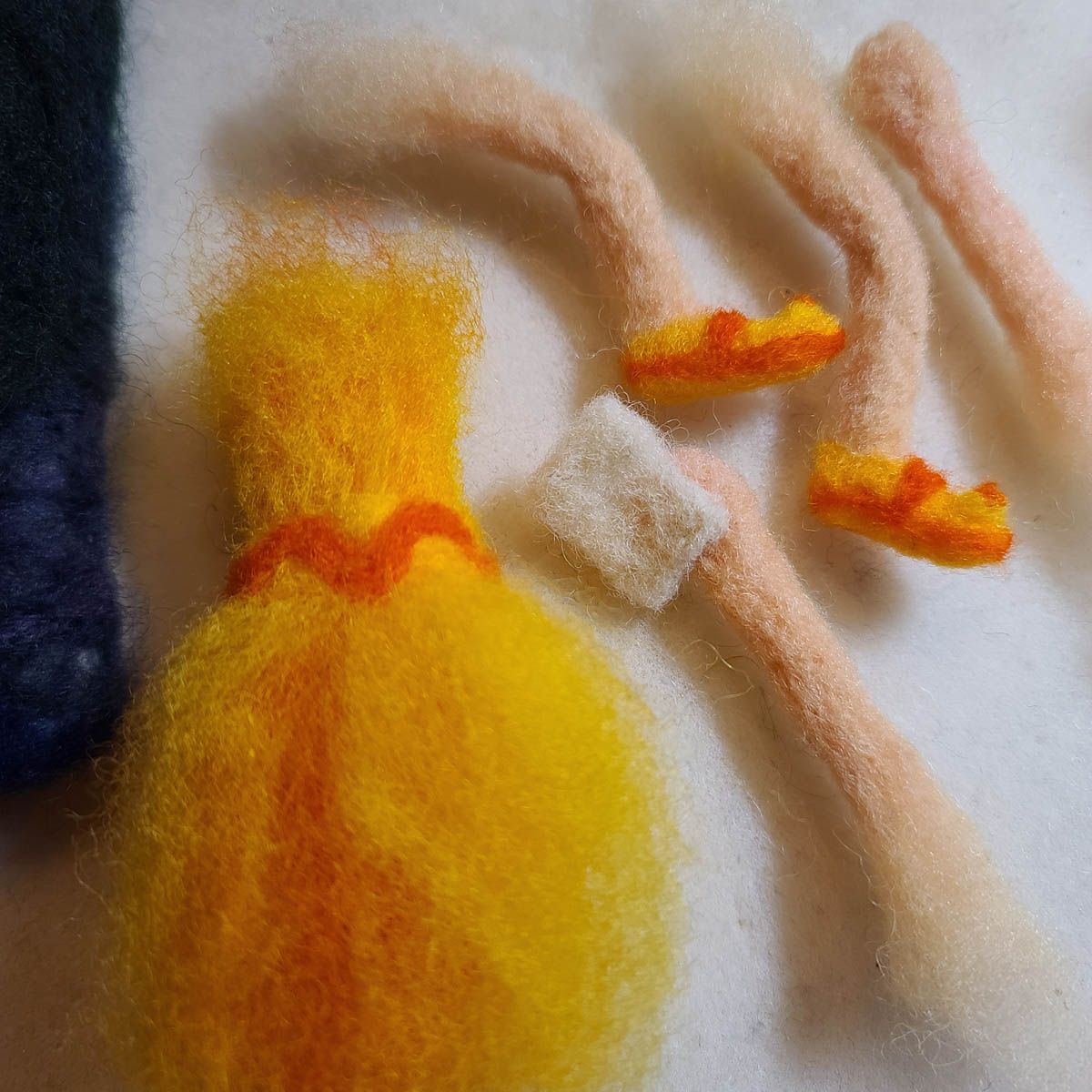 With the toys and sunspot situated on the nightstand, the next step was to build the Sun Fairy. When I add fairies to my illustrations I use two methods, 1. I needle felt a 3-dimensional doll that is attached to the base illustration (as I’ve done here), or 2. I felt the figure in 2-dimensions directly onto the base and the figure only slightly pops out of the surface plane of the picture.