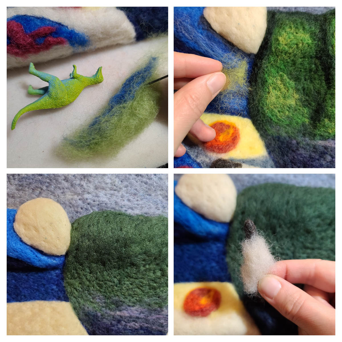 Over the course of two weeks, I used my 4:00 am quiet time to steadily develop the bedroom with a nightstand scattered with toys, blanket, and pillows all framing the sleeping child. The sunspot sitting bedside has a very special meaning in the story and it is flooding the child’s face with light. Like my other felted artwork, I started with a thick, sturdy wool base that has a wool hanging hook already attached to the back.