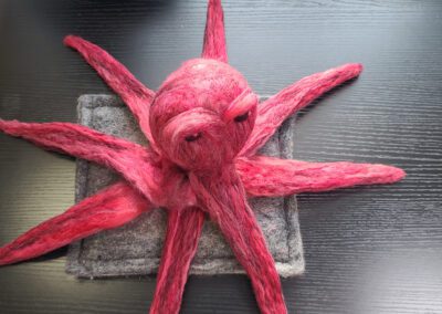 The large octopus featured in this video started as a lap project on long car rides during family adventure days. Tentacles are a great option for car felting! This one of a kind piece is available for sale: Octopus II. With every new octopus I create I am also thinking up stories for an underwater children’s book. These early creations are my character studies.