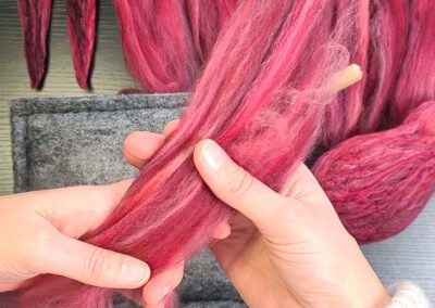 Step 4. With the remaining large batt create 9 evenly sized portions. Do the same with the smaller dark wool batt. You’ll need to hold your hands far enough apart that you’re not holding both ends of the fiber. When your hands are close together, the lighter your grasp, the easier it is to pull the fibers apart. Place one of each tone to the side (these will be for the bottom of the head after tentacles are attached.