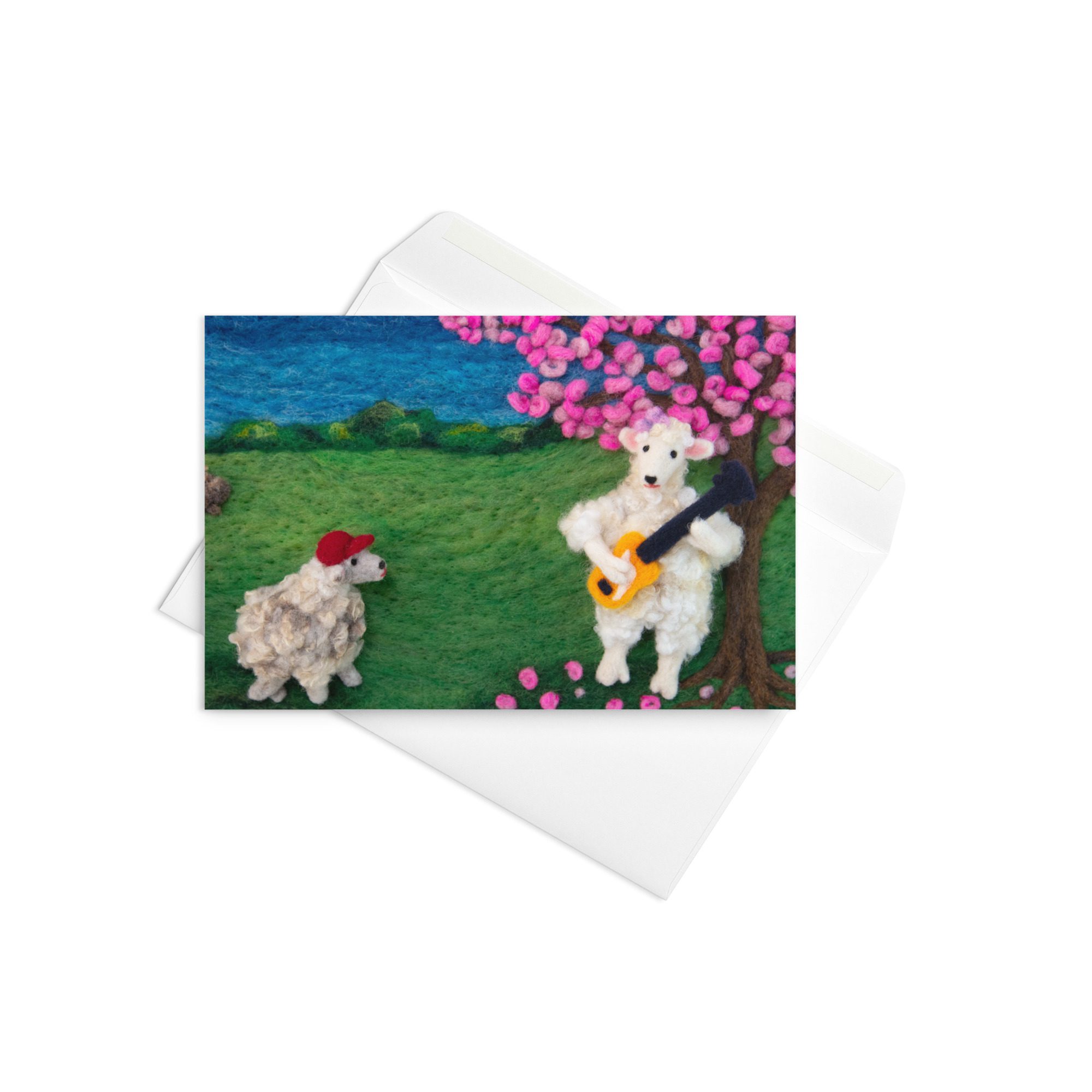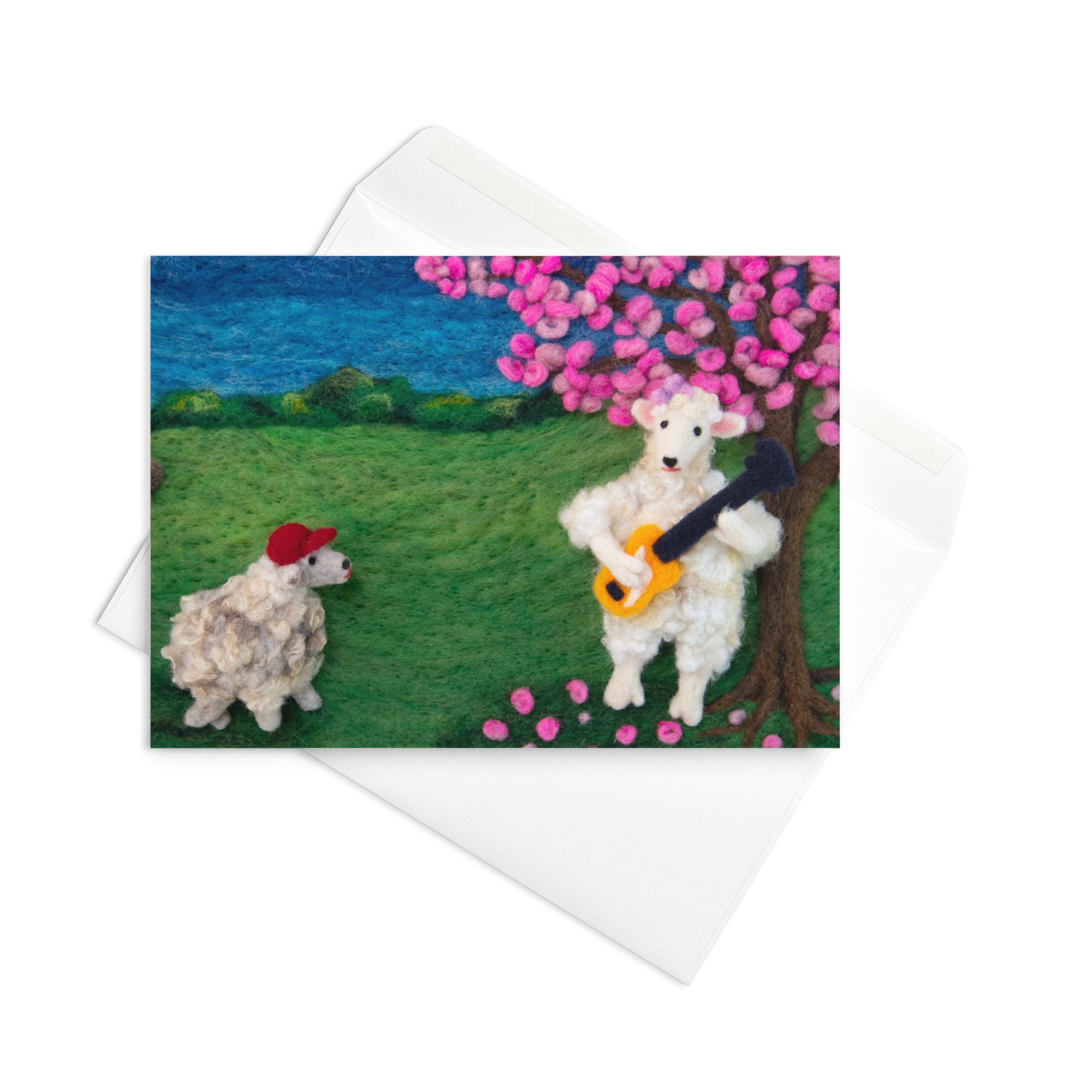 Share a thoughtful note with this blank art greeting card featuring Leona’s Bass, a felted illustration by Maine fiber artist Hillary Dow. With a sweet sheep musician, blooming tree, and storybook-inspired landscape, this design brings a playful sense of music, spring, and handmade charm to your correspondence. Printed in vibrant full color on sturdy premium paperboard, this card is a lovely choice for music lovers, bass players, birthdays, thank you notes, artist stationery, and everyday correspondence.