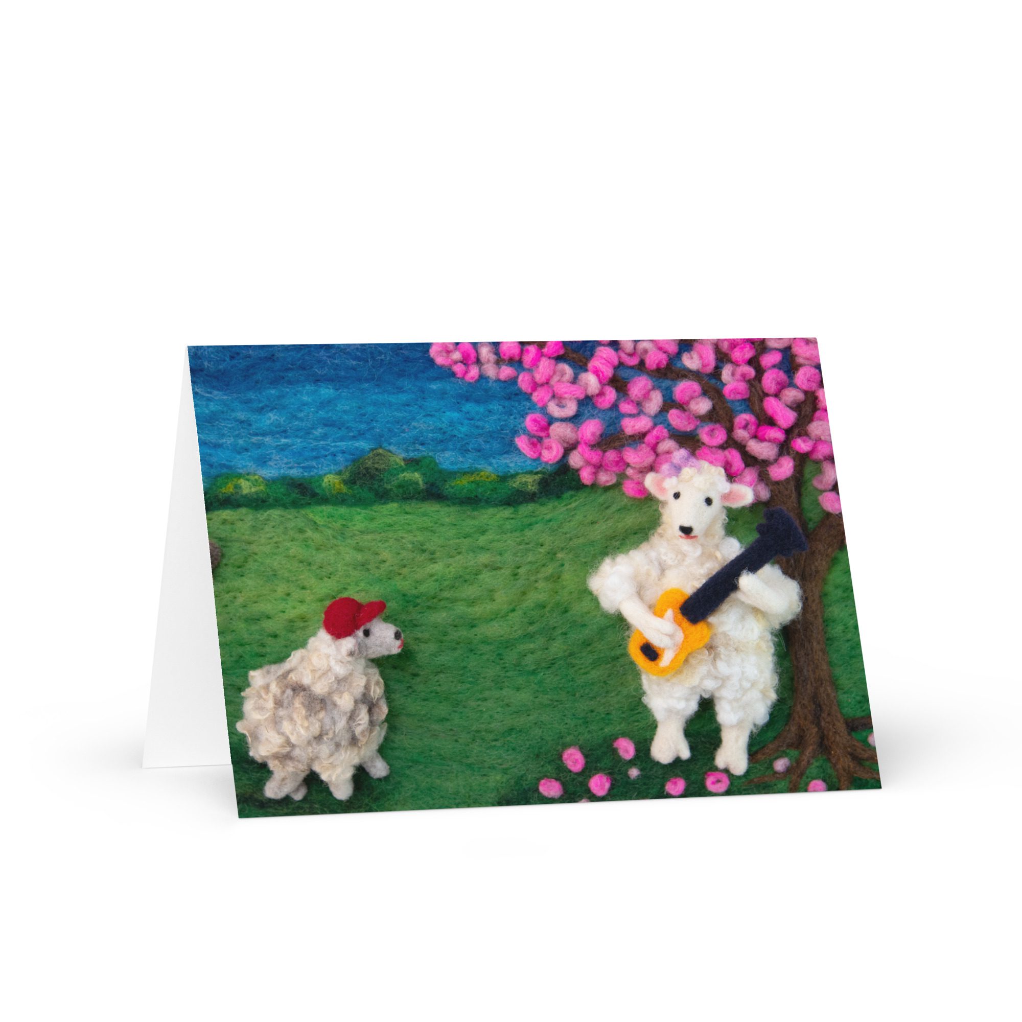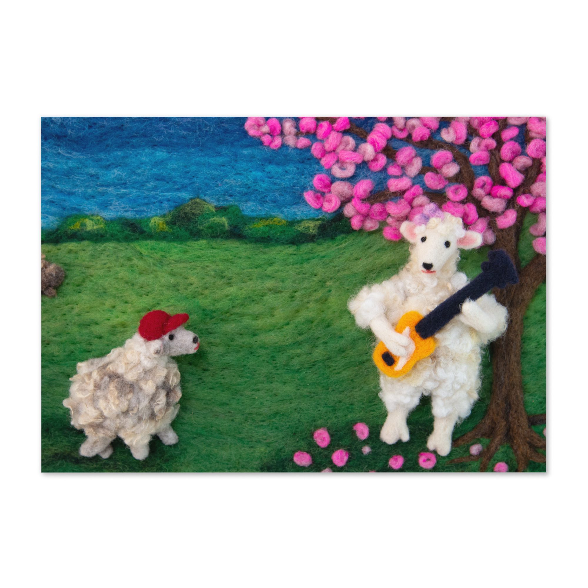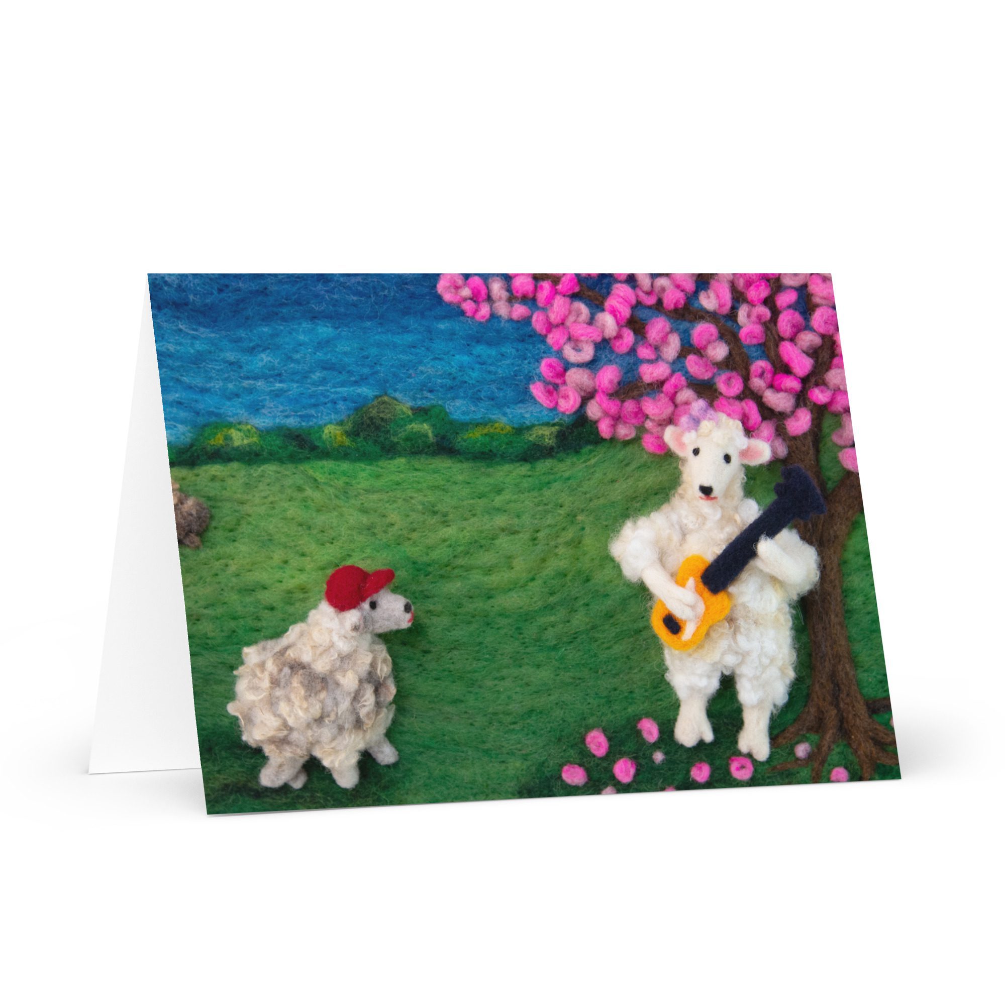 Share a thoughtful note with this blank art greeting card featuring Leona the sheep playing a bass guitar, a felted illustration by Maine fiber artist Hillary Dow. With a sweet sheep musician, blooming tree, and storybook-inspired landscape, this design brings a playful sense of music, spring, and handmade charm to your correspondence. Printed in vibrant full color on sturdy premium paperboard, this card is a lovely choice for music lovers, bass players, birthdays, thank you notes, artist stationery, and everyday correspondence.