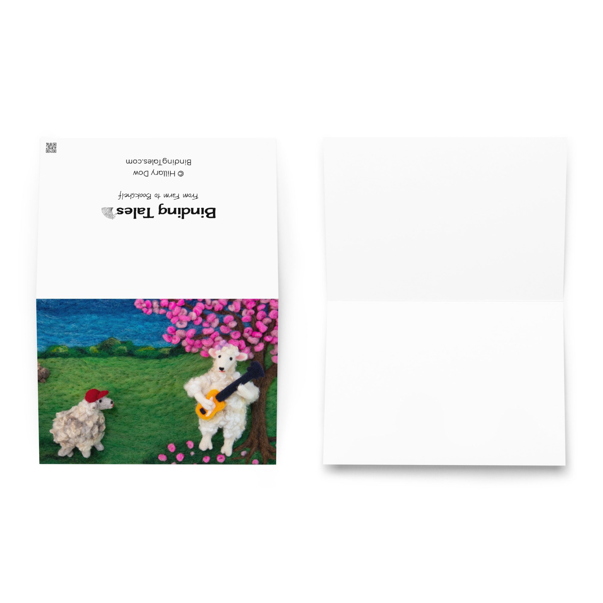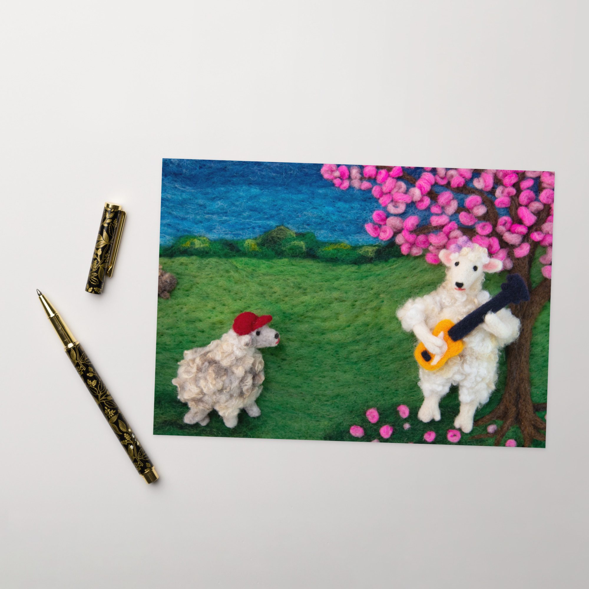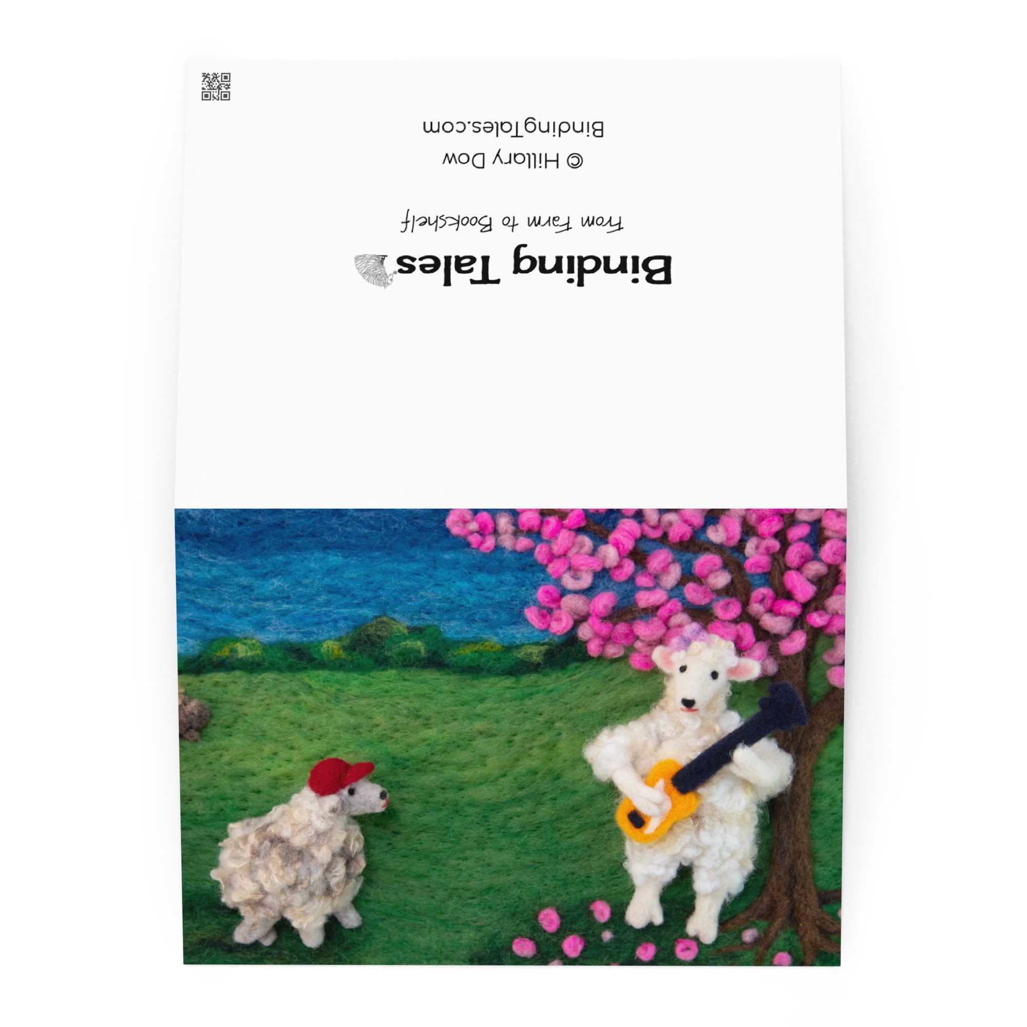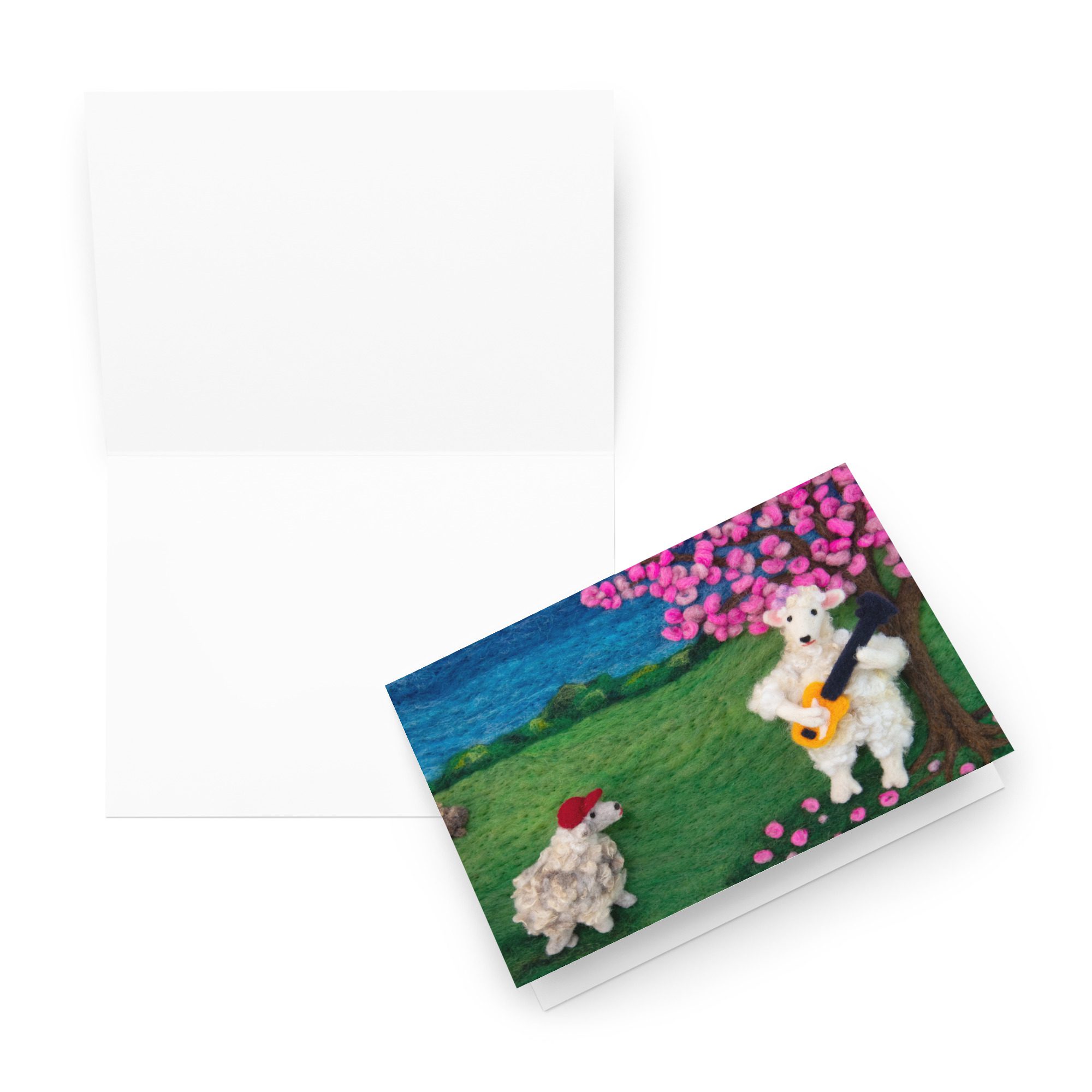 Share a thoughtful note with this blank art greeting card featuring Leona the sheep playing a bass guitar, a felted illustration by Maine fiber artist Hillary Dow. With a sweet sheep musician, blooming tree, and storybook-inspired landscape, this design brings a playful sense of music, spring, and handmade charm to your correspondence. Printed in vibrant full color on sturdy premium paperboard, this card is a lovely choice for music lovers, bass players, birthdays, thank you notes, artist stationery, and everyday correspondence.