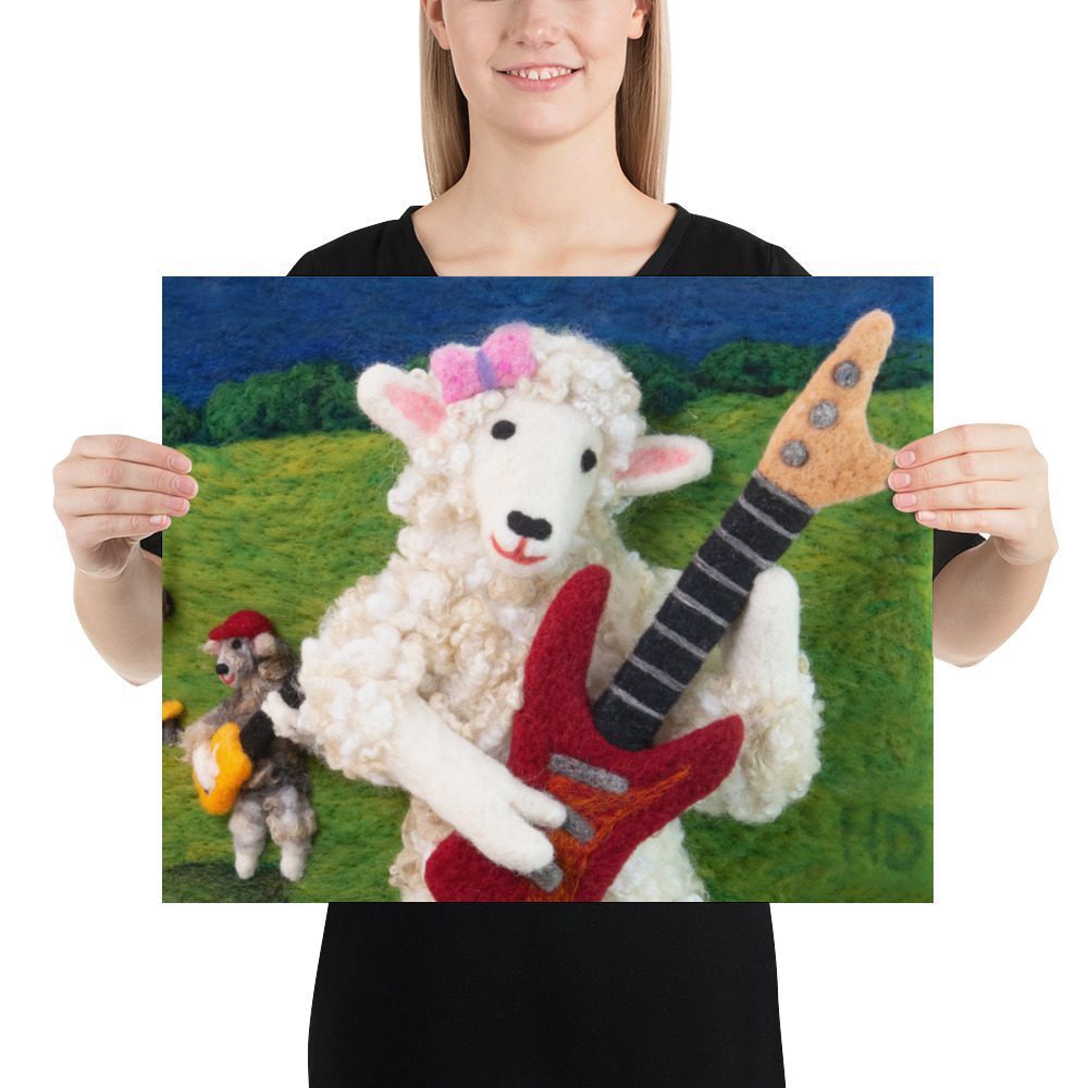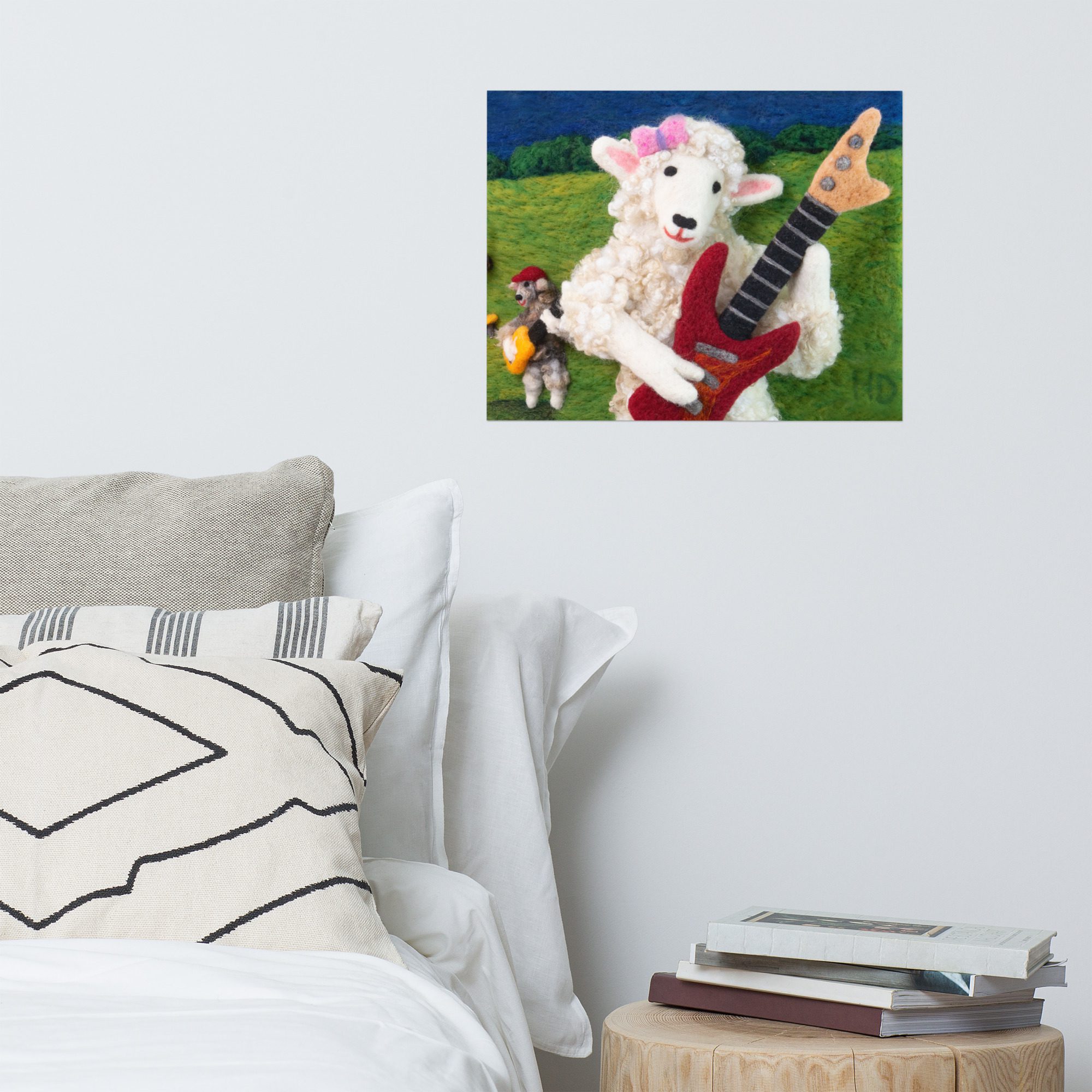 Leona’s guitar art print brings a playful burst of storybook charm to your walls with Leona’s Guitar, a whimsical felted illustration by Maine fiber artist Hillary Dow. Featured on the cover of Flock of Rock, this lively sheep art print captures the joy of music, imagination, and handmade artistry in Dow’s signature needle-felted style. With rich texture, bold color, and expressive detail, this matte poster makes a cheerful addition to a nursery, child’s bedroom, classroom, reading nook, music room, or creative studio.