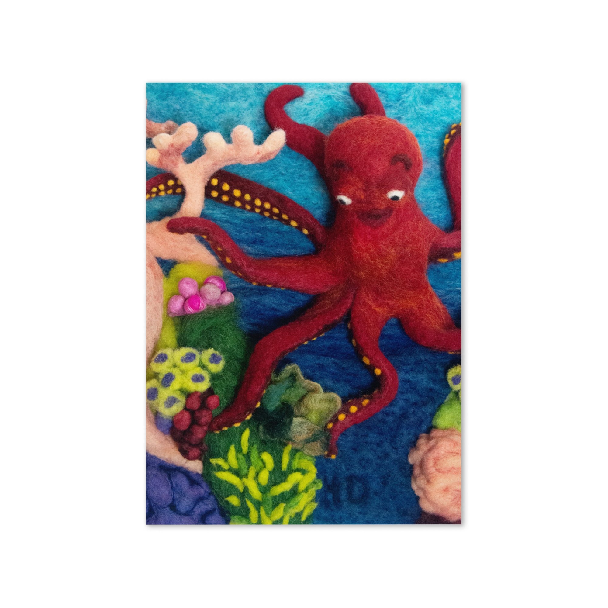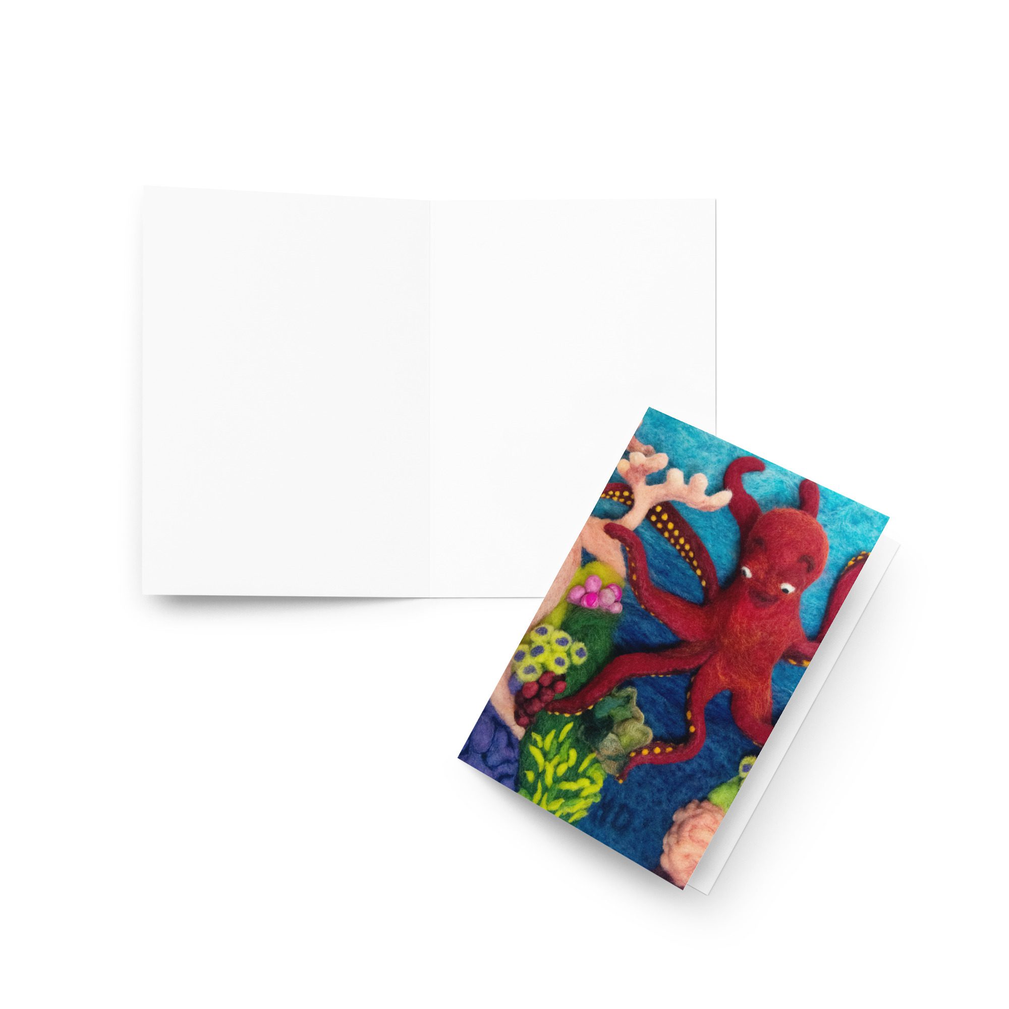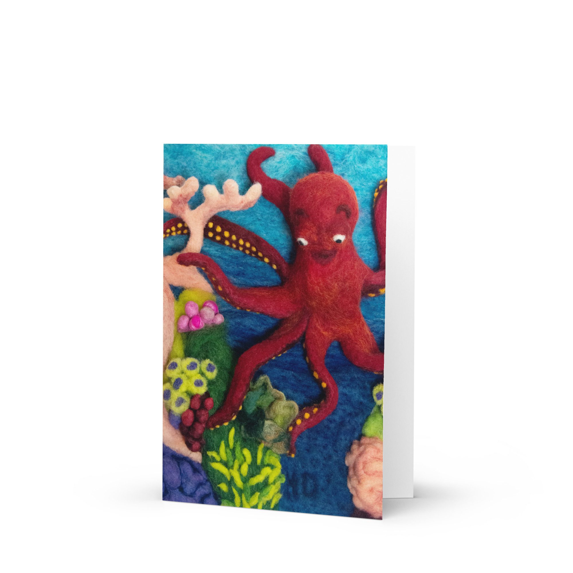 Celebrate ocean life and handmade storytelling with this blank greeting card featuring Octopus 1, a felted illustration by Maine fiber artist Hillary Dow from her children’s book Octa Hero Saves the Reef. With its bright red octopus, colorful coral reef, and underwater details, this octopus art greeting card is a fun and artful choice for ocean lovers, marine life fans, reef lovers, birthdays, thank you notes, and meaningful handwritten messages. Printed in rich, vibrant color on thick premium paperboard and available in small, medium, and large sizes, it is both a beautiful card and a small piece of art. Each card comes with a complimentary envelope for easy mailing or gifting.