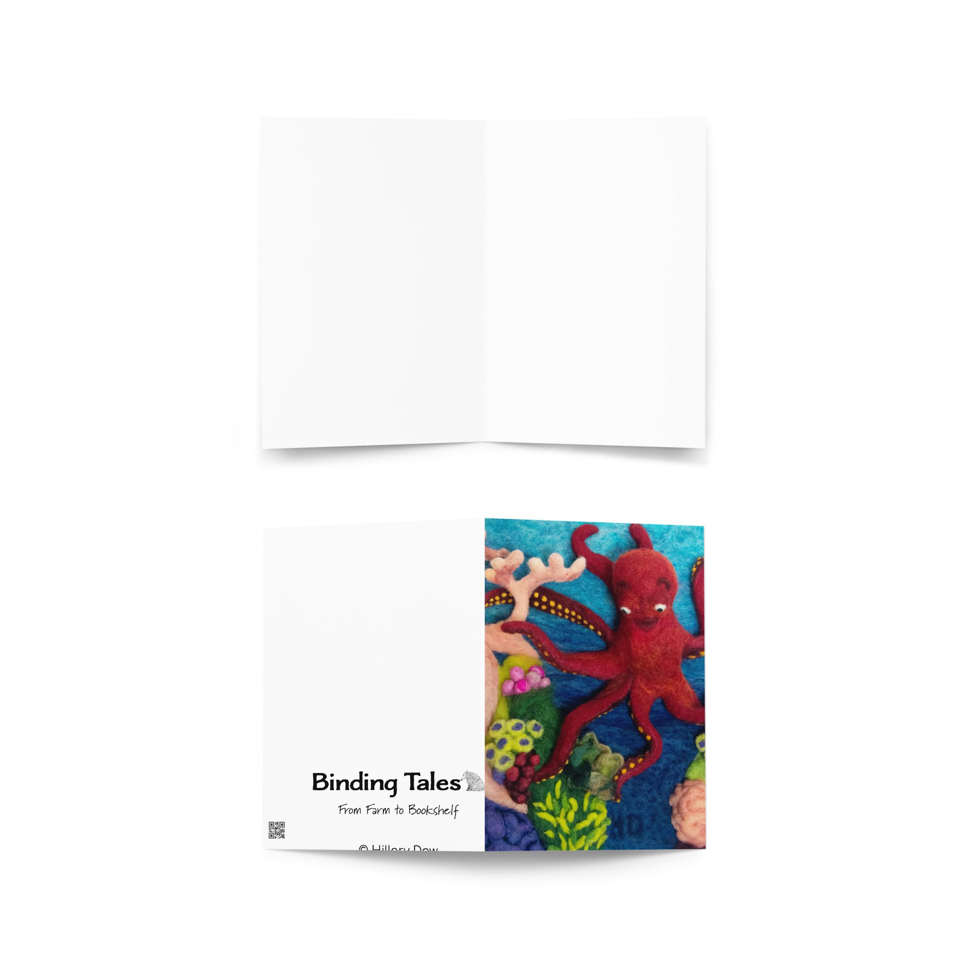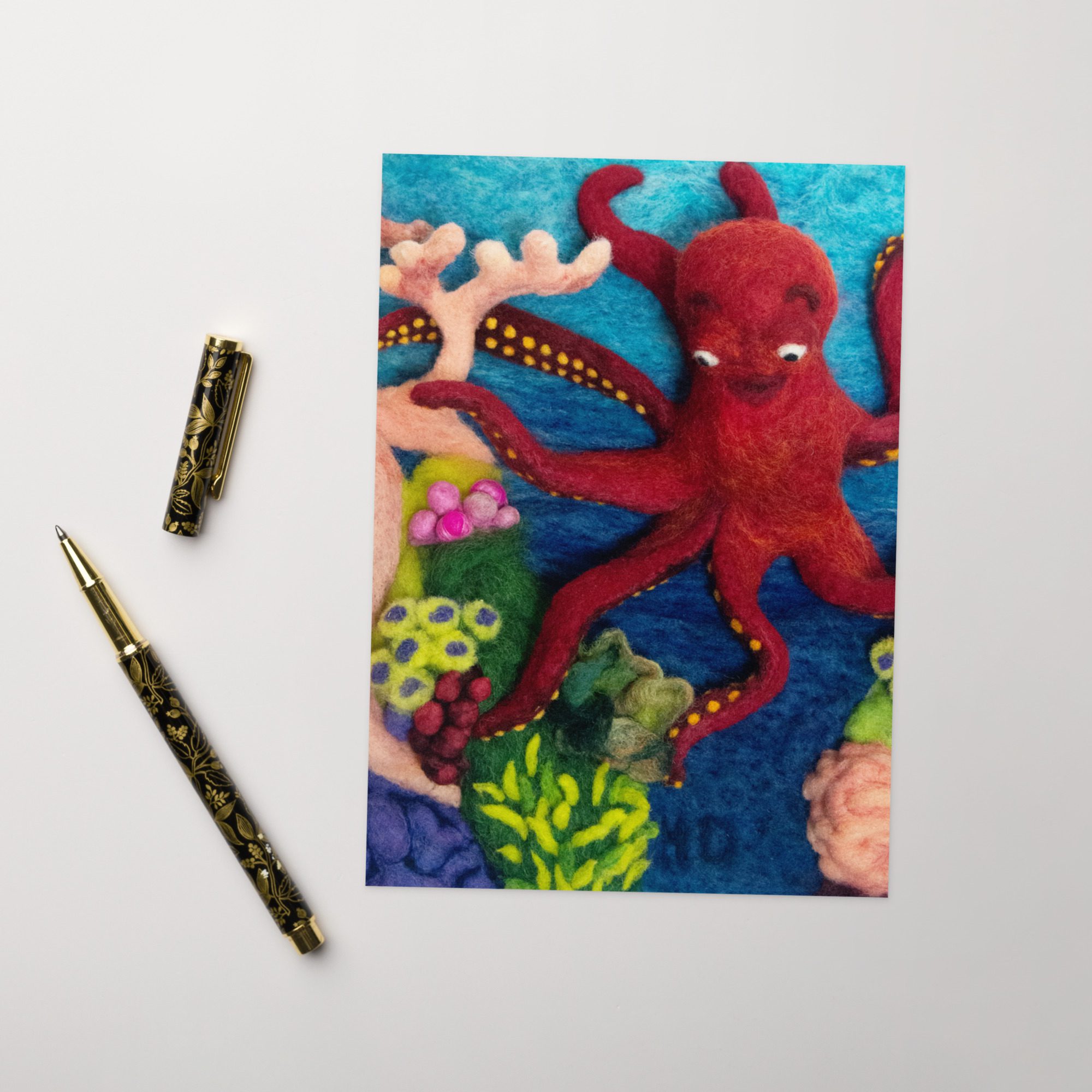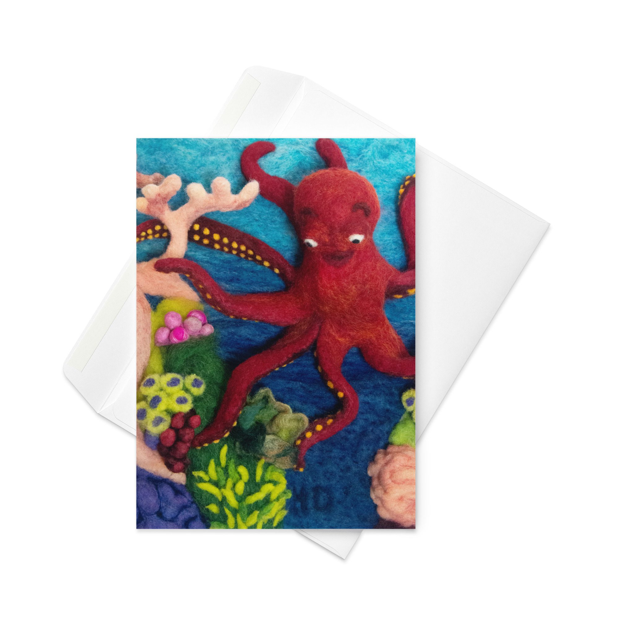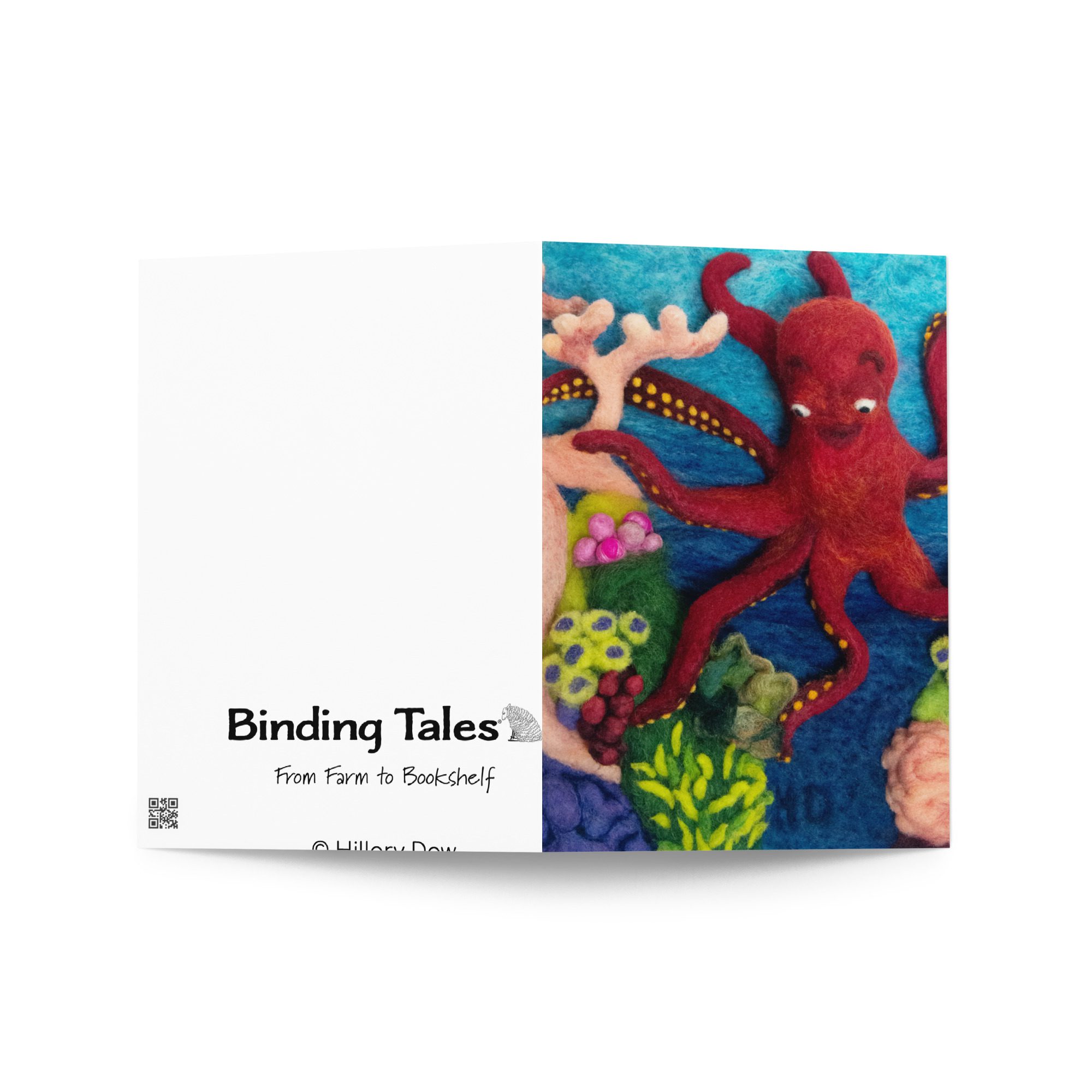 Celebrate ocean life and handmade storytelling with this blank greeting card featuring Octopus 1, a felted illustration by Maine fiber artist Hillary Dow from her children’s book Octa Hero Saves the Reef. With its bright red octopus, colorful coral reef, and underwater details, this octopus art greeting card is a fun and artful choice for ocean lovers, marine life fans, reef lovers, birthdays, thank you notes, and meaningful handwritten messages. Printed in rich, vibrant color on thick premium paperboard and available in small, medium, and large sizes, it is both a beautiful card and a small piece of art. Each card comes with a complimentary envelope for easy mailing or gifting.