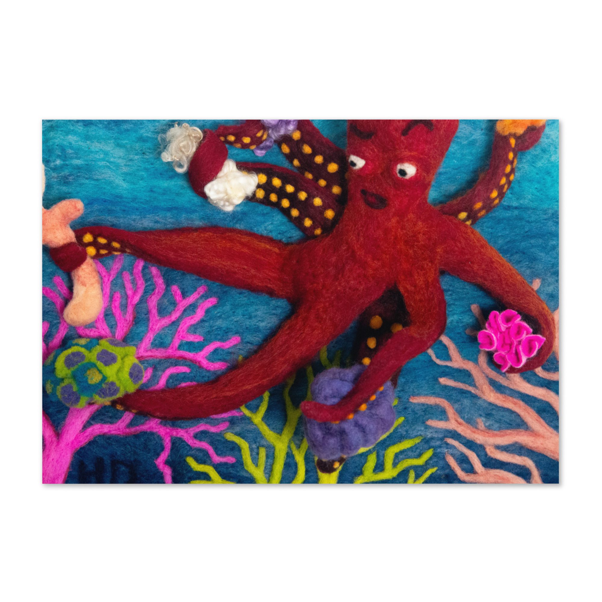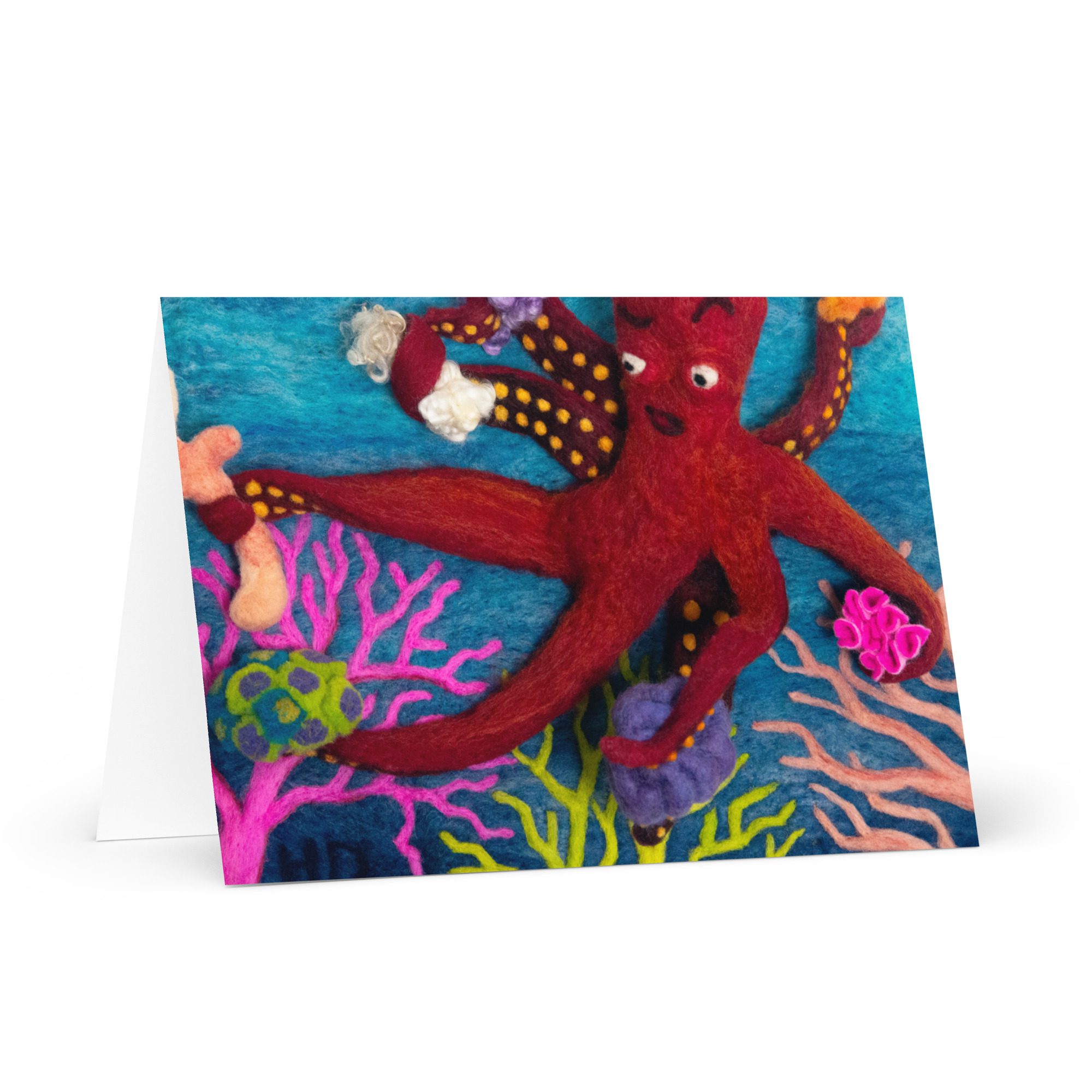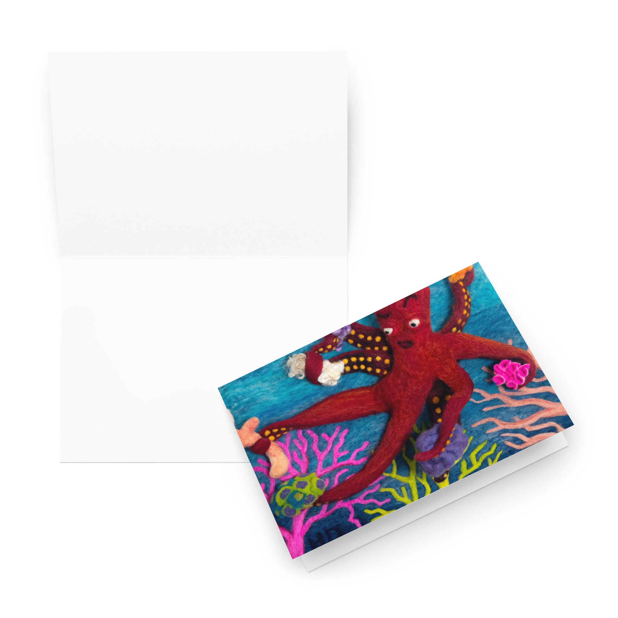 Share a thoughtful note with this blank art greeting card featuring Octopus 3, a colorful wool illustration by Maine fiber artist Hillary Dow. Inspired by Hillary’s children’s book, Octahero Saves the Reef, this lively underwater scene features a bright red octopus stretching across a colorful coral reef filled with bold ocean hues and playful handmade detail. With its sense of movement and rich reef color, this design celebrates octopus art, coral reef life, marine imagination, and underwater storytelling.