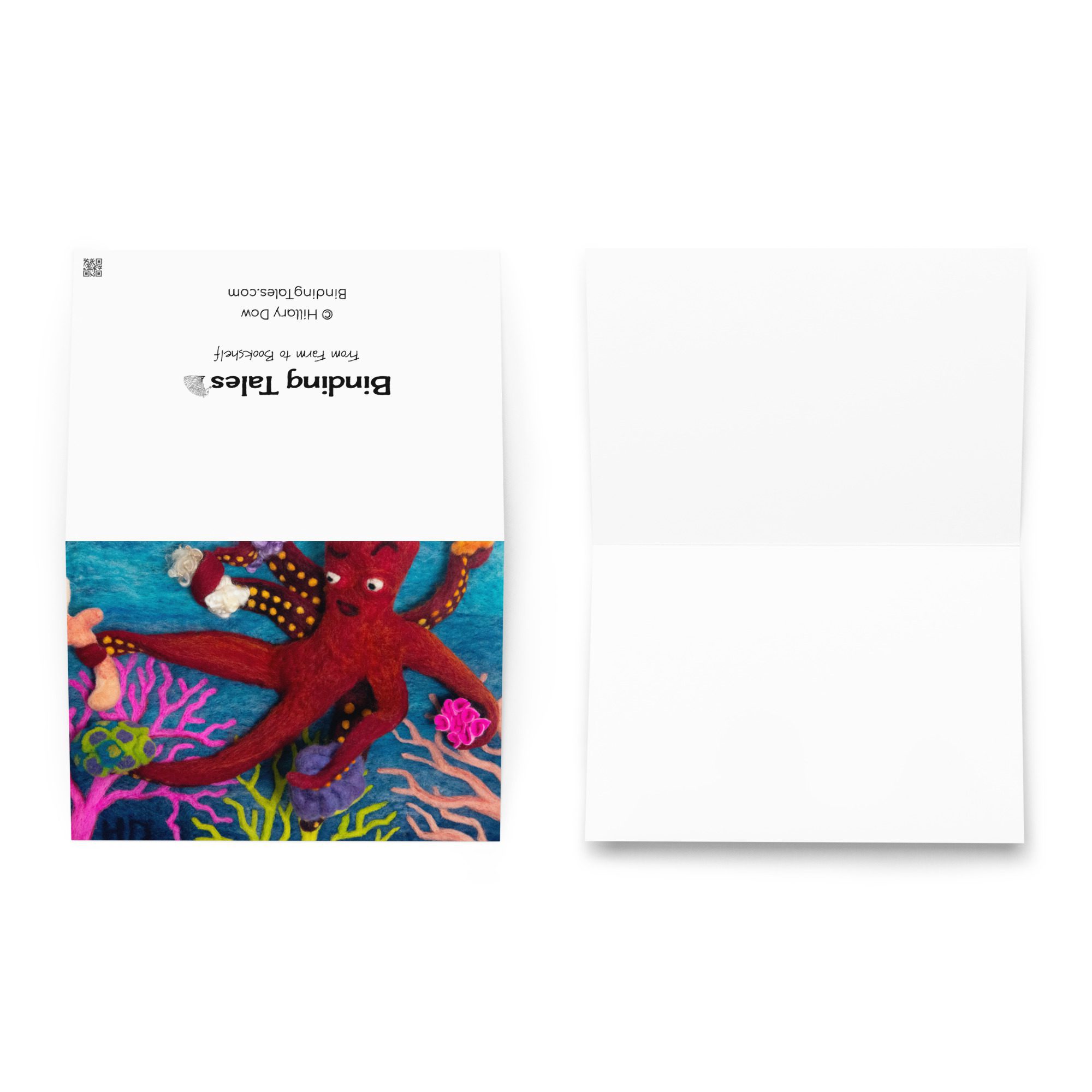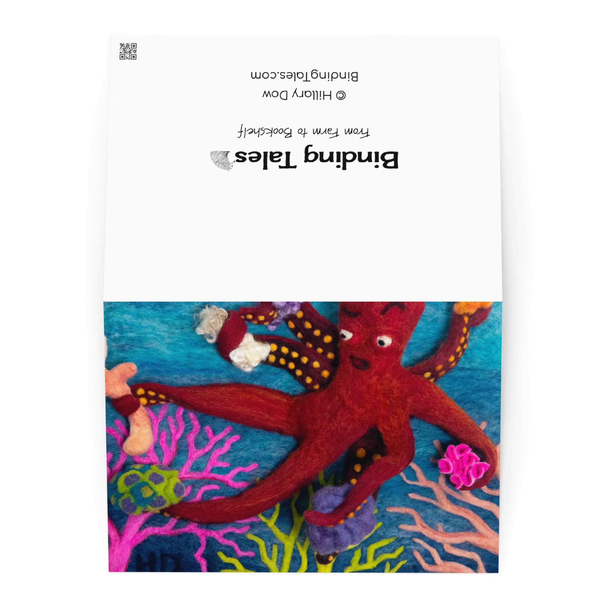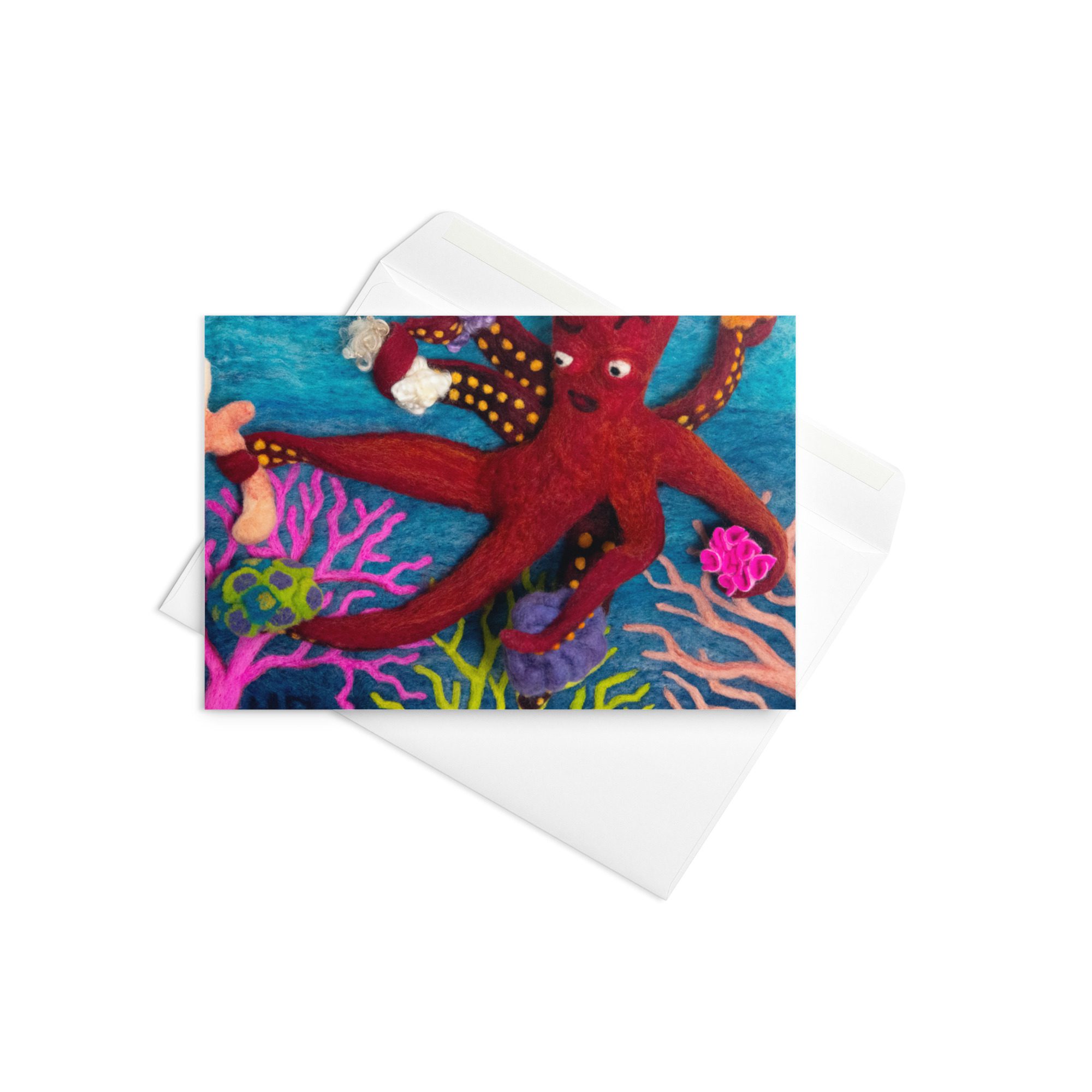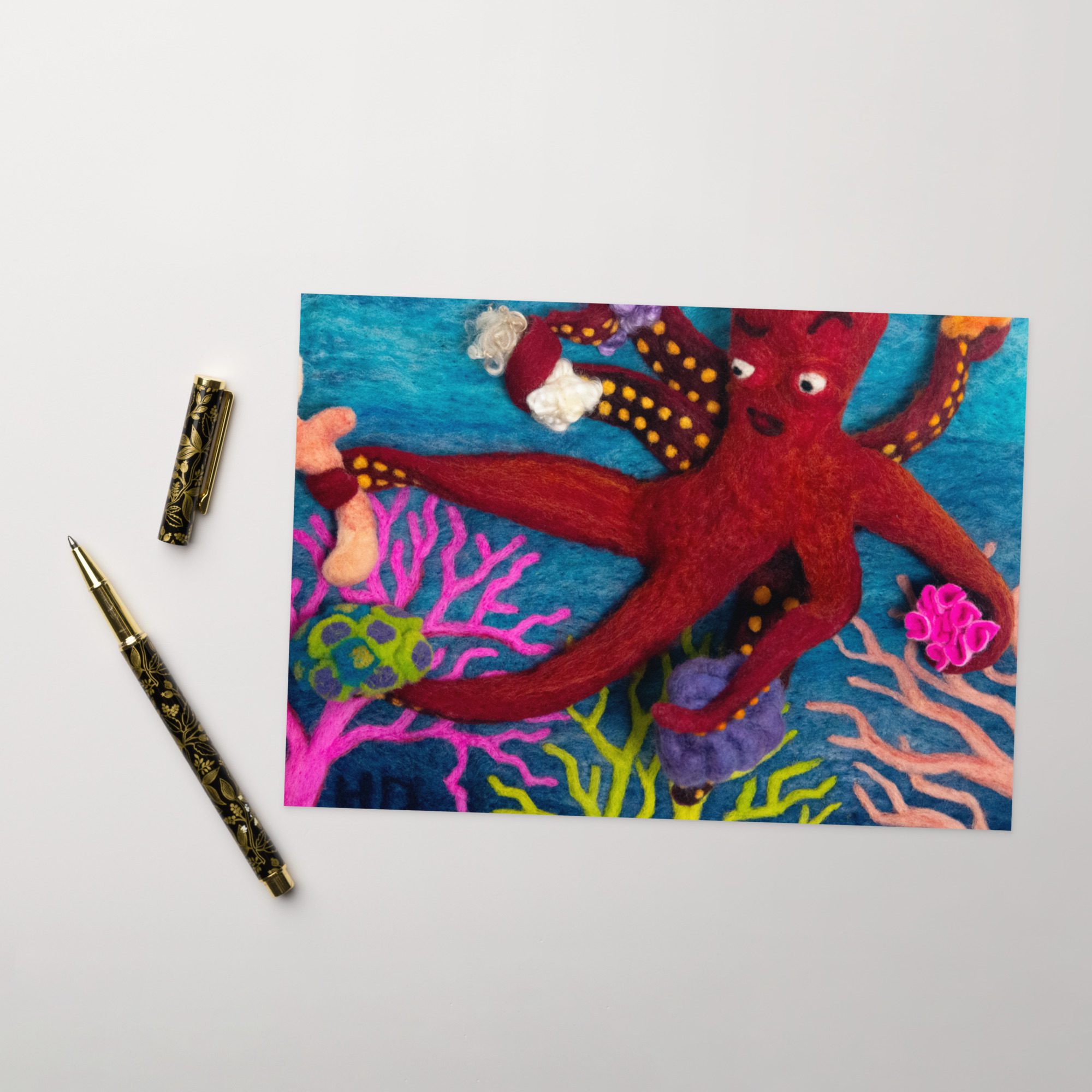 Share a thoughtful note with this blank art greeting card featuring Octopus 3, a colorful wool illustration by Maine fiber artist Hillary Dow. Inspired by Hillary’s children’s book, Octahero Saves the Reef, this lively underwater scene features a bright red octopus stretching across a colorful coral reef filled with bold ocean hues and playful handmade detail. With its sense of movement and rich reef color, this design celebrates octopus art, coral reef life, marine imagination, and underwater storytelling.